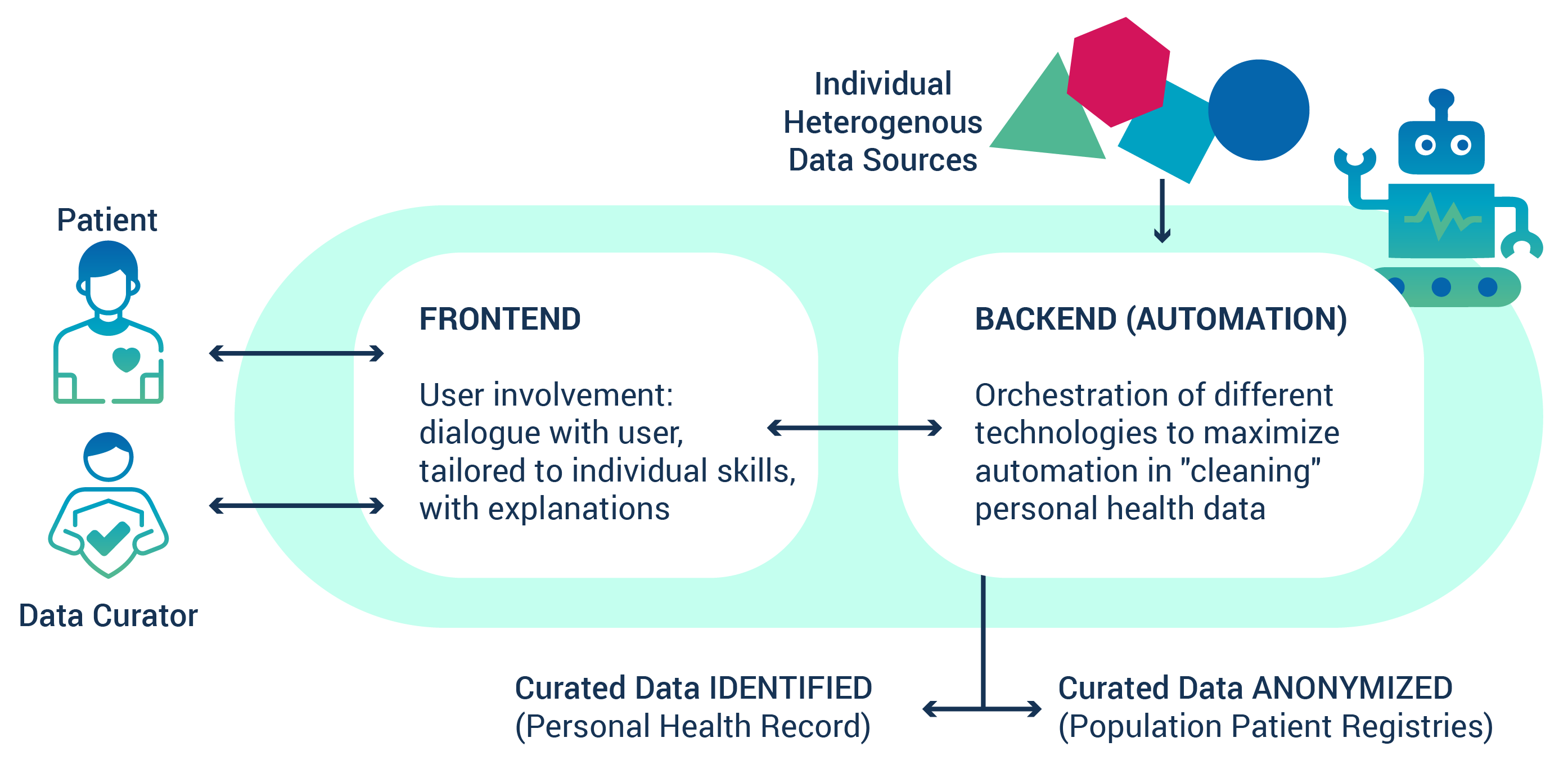 AIDAVA will fill this gap by prototyping and testing an AI powered, virtual assistant maximising automation of data curation & publishing of computable knowledge derived from unstructured and structured, heterogeneous data. The assistant includes a backend with a library of AI-based data curation tools and a frontend based on human-AI interaction modules that will help users when automation is not possible, while adapting to users’ preferences. The exceptional interdisciplinary team of the consortium will develop and test two versions of this virtual assistant with hospitals and emerging personal data intermediaries, around breast cancer patient registries and longitudinal health records for cardio-vascular patients, in three languages.